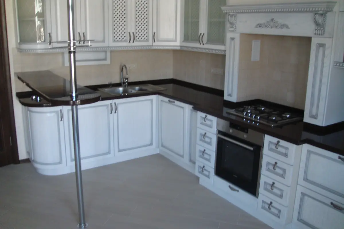 Столешница с небольшой барной стойкой. Все углы столешницы имеют плавные формы закругленные.