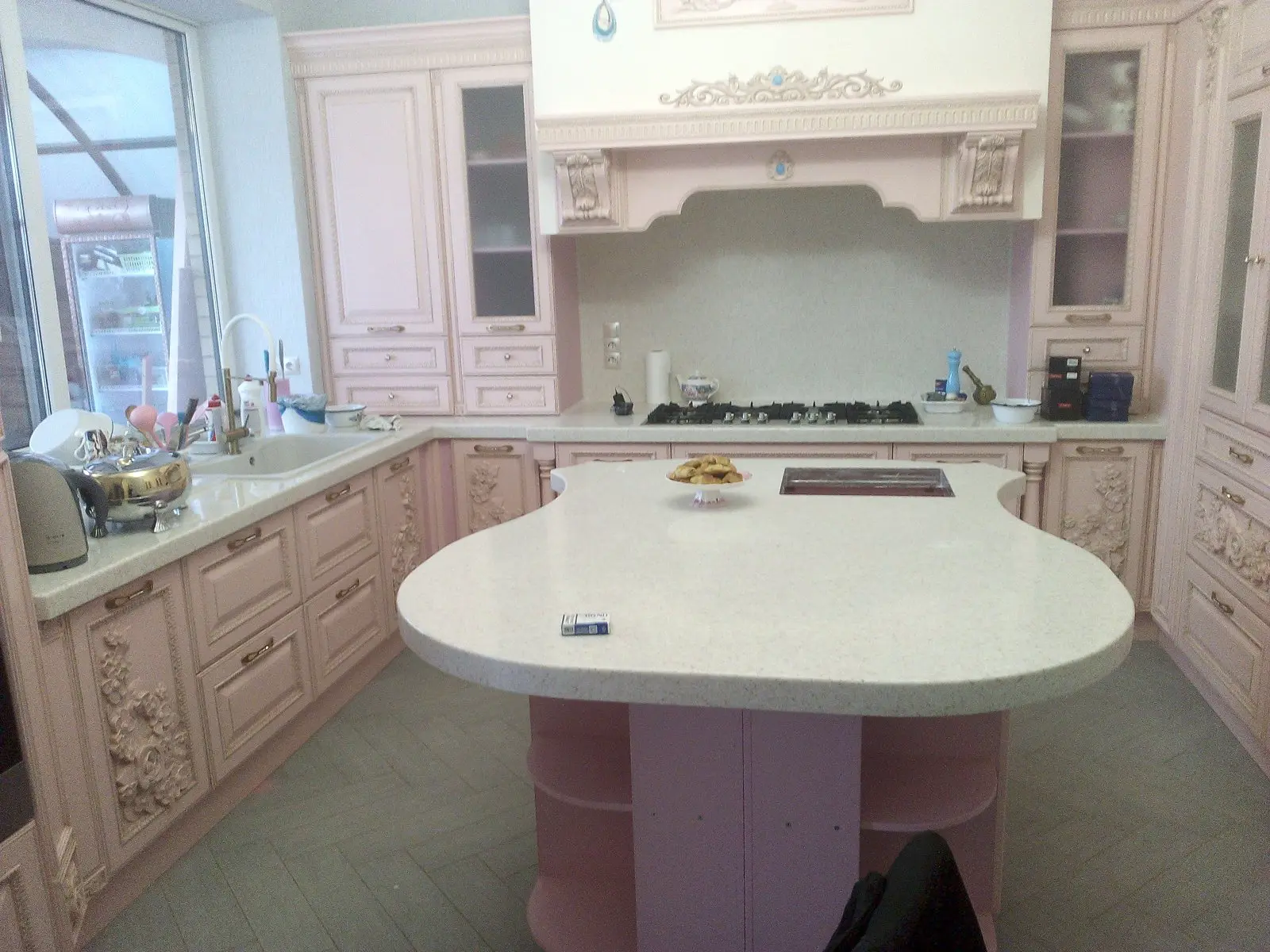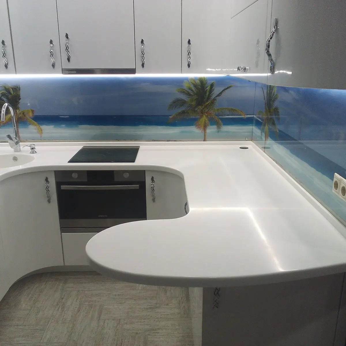 Накладная мойка, врезная варочная поверхность + стеновая панель так же выполнена из искусственного акрилового камня .
